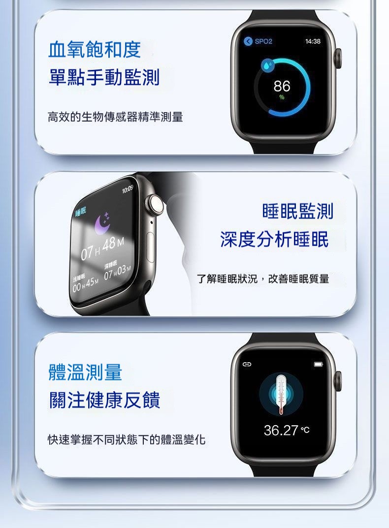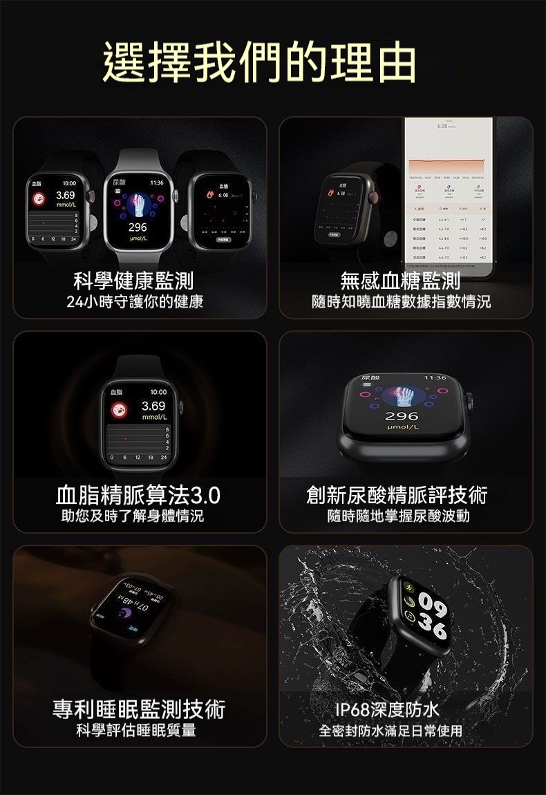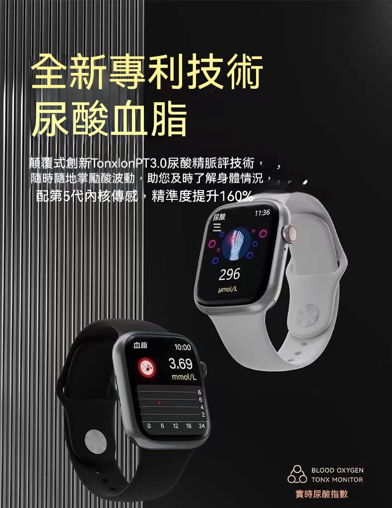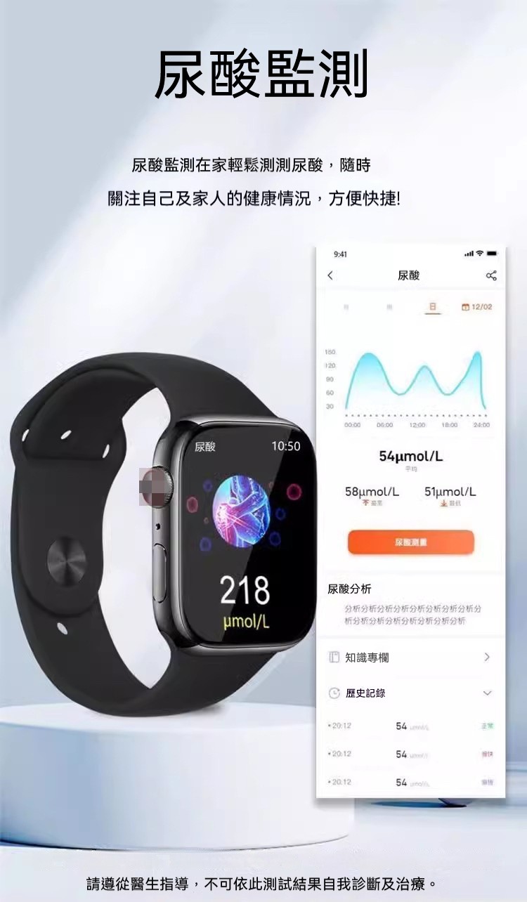【科技躍遷,健康盡在掌握】這款智慧手表采用最新無創技術✨,實時監測血糖水平🩸,精准無誤。 ⚖️ 【尿酸監測,飲食無憂】📊尿酸變化一目了然【自動血壓監測,守護心血管❤️ 】 手錶自動定時测量,數據即時同步📲,異常提醒⚠️,爲妳的心血管健康築起堅固防線! 【💤 深度睡眠監測,好夢連連 】🌙睡眠質量決定生活質量!智能分析的睡眠周期,深度、淺睡壹目了然📈,助妳調整作息 【📱 智能互聯,生活更精彩】🔗無缝連接手機,信息提醒📨、音樂播放🎧、運動記錄🏃♀️.壹表在手,便捷生活全搞定! 【送禮自用,兩相宜】⌚時尚設計,